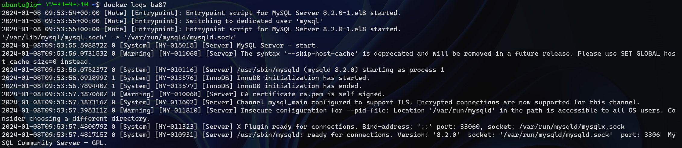 2024-01-08 09:48:16+00:00 [Note] [Entrypoint]: Entrypoint script for MySQL Server 8.2.0-1.el8 started.