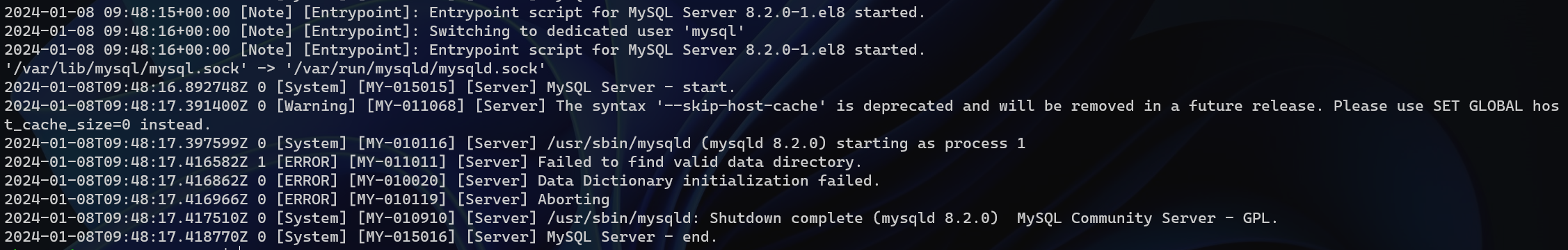 2024-01-08T09:48:17.416582Z 1 [ERROR] [MY-011011] [Server] Failed to find valid data directory.