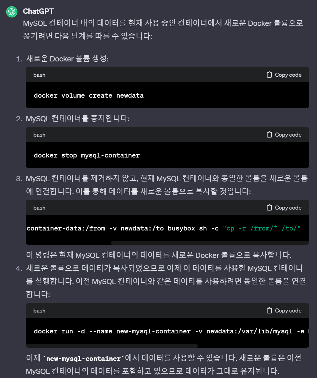 당시 띄워둔 MySQL 컨테이너를 처음 실행할 때 volume 옵션을 주지 않았기 때문에 우선 어딘가에 저장된 데이터를 새로 생성한 볼륨에 옮기는 작업을 하고자 했다.