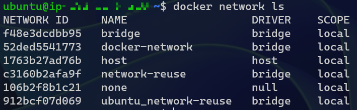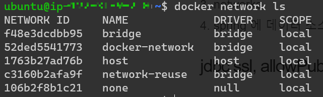 docker network ls 로 생성된 네트워크를 확인할 수 있다.