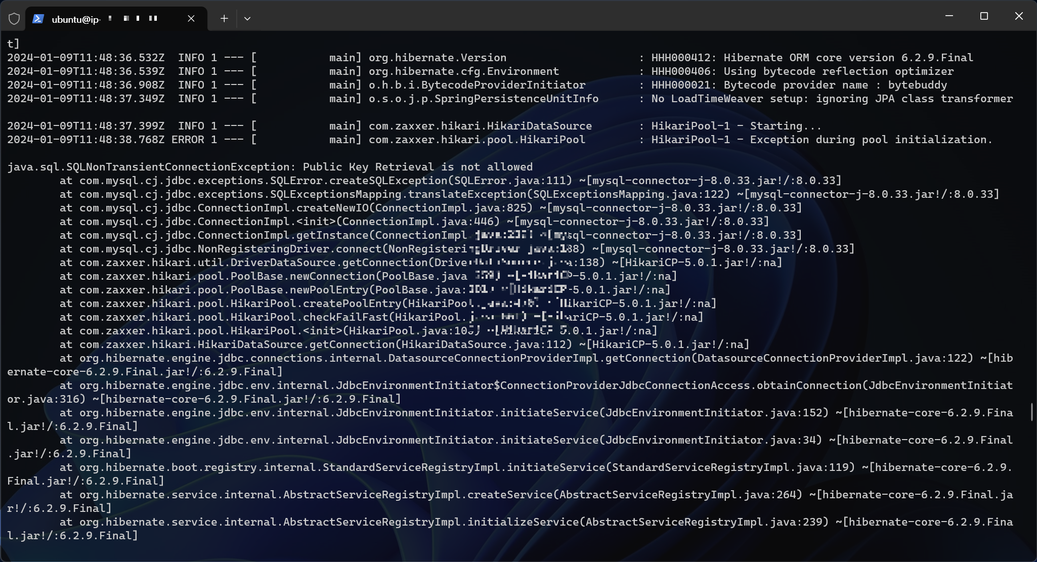 아까 입력해주었던 useSSL=false 뒤에 &allowPublicKeyRetrieval=true 를 추가해주면 해결이 된다한다.