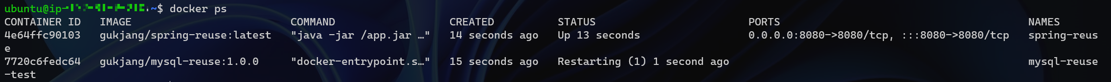 MySQL 컨테이너에서는 더이상 오류를 뿜어내지 않고 시간이 지나도 재실행되지 않는다.