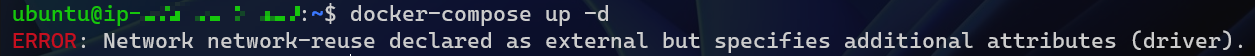 ERROR: Network network-reuse declared as external but specifies additional attributes (driver).