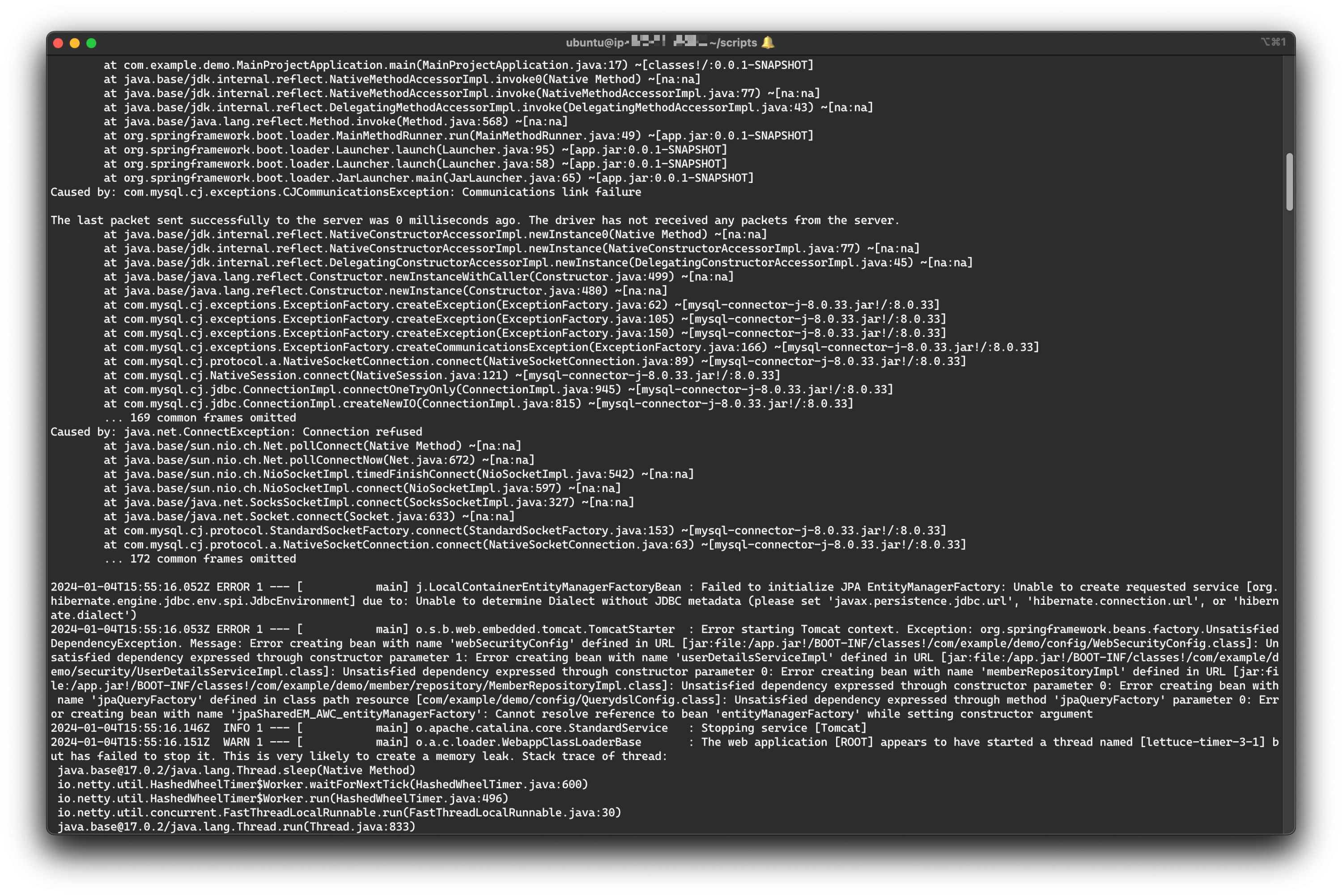 0 ~ 3번까지의 과정을 하나 하나 해결하였지만 여전히 Spring 에서는 communication link failure 가 떴다.