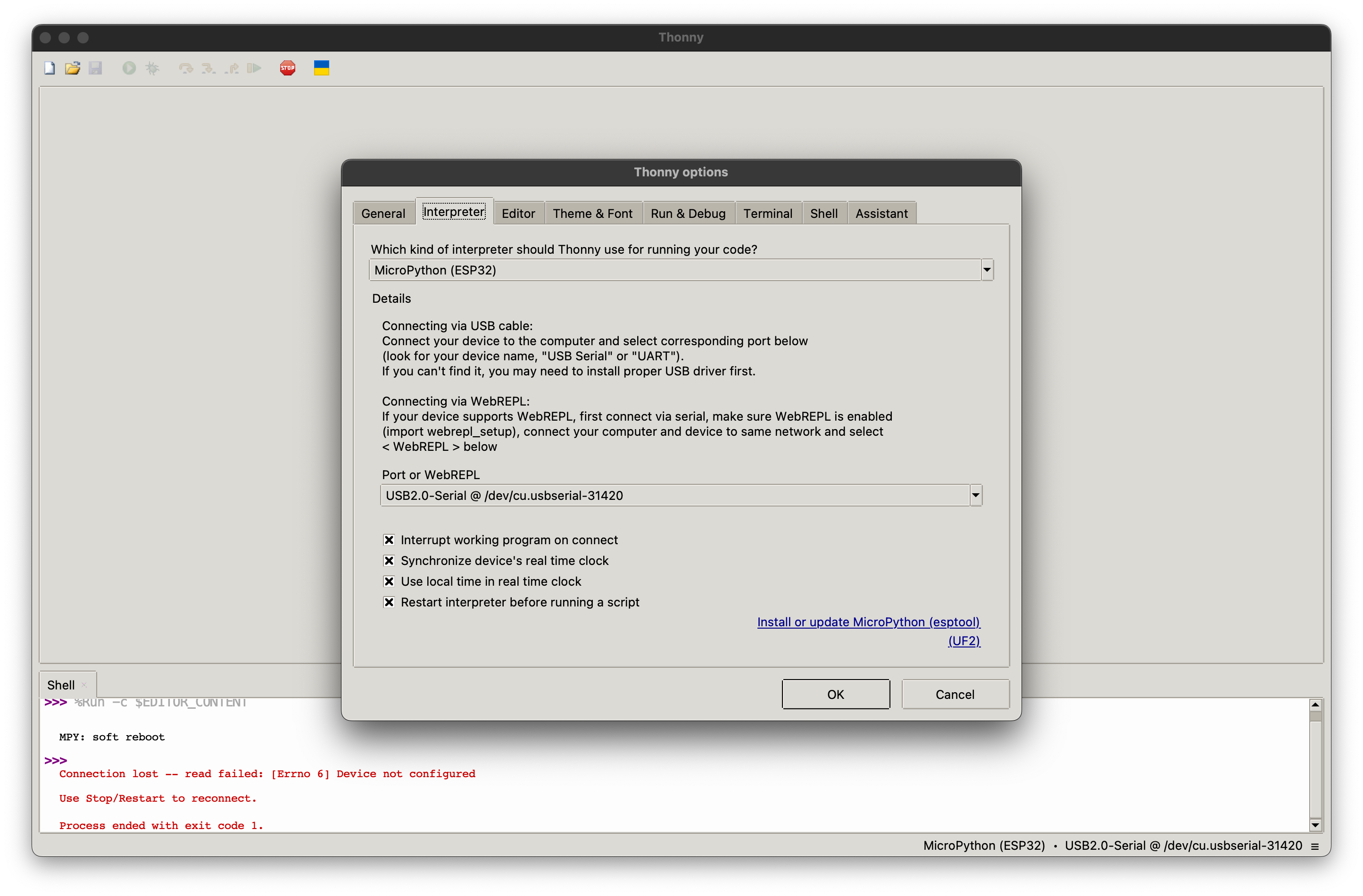 Thonny 를 깔고 Configure Interpreter 에서 ESP32 를 설정해준다.