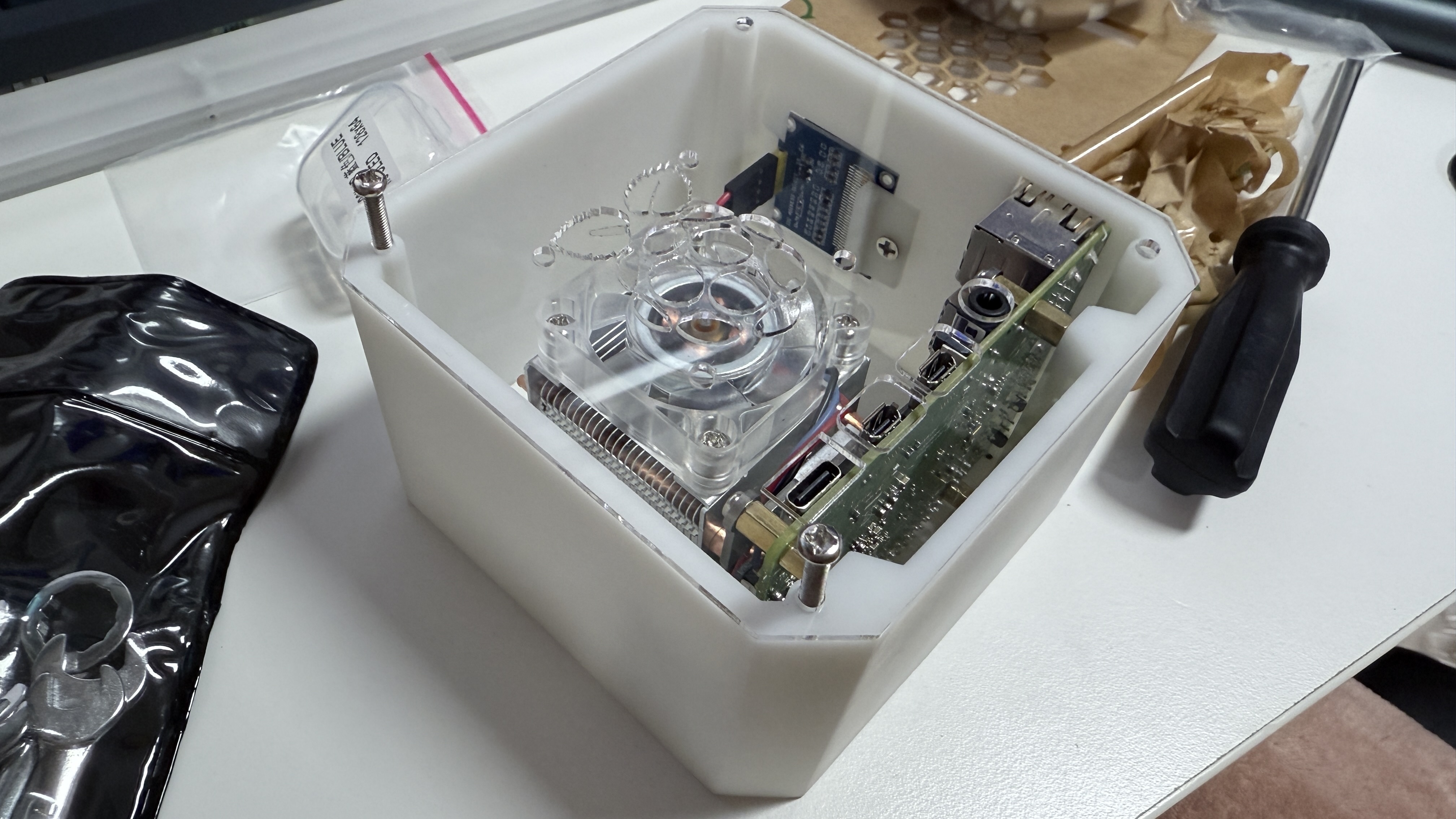 마지막 단계인 측면 아크릴 판을 조립해야하는데 사진에 있는 볼트는 길이가 너무 길고 남은 볼트들을 쓰자니 다 짧은 것들만 남아있었다.