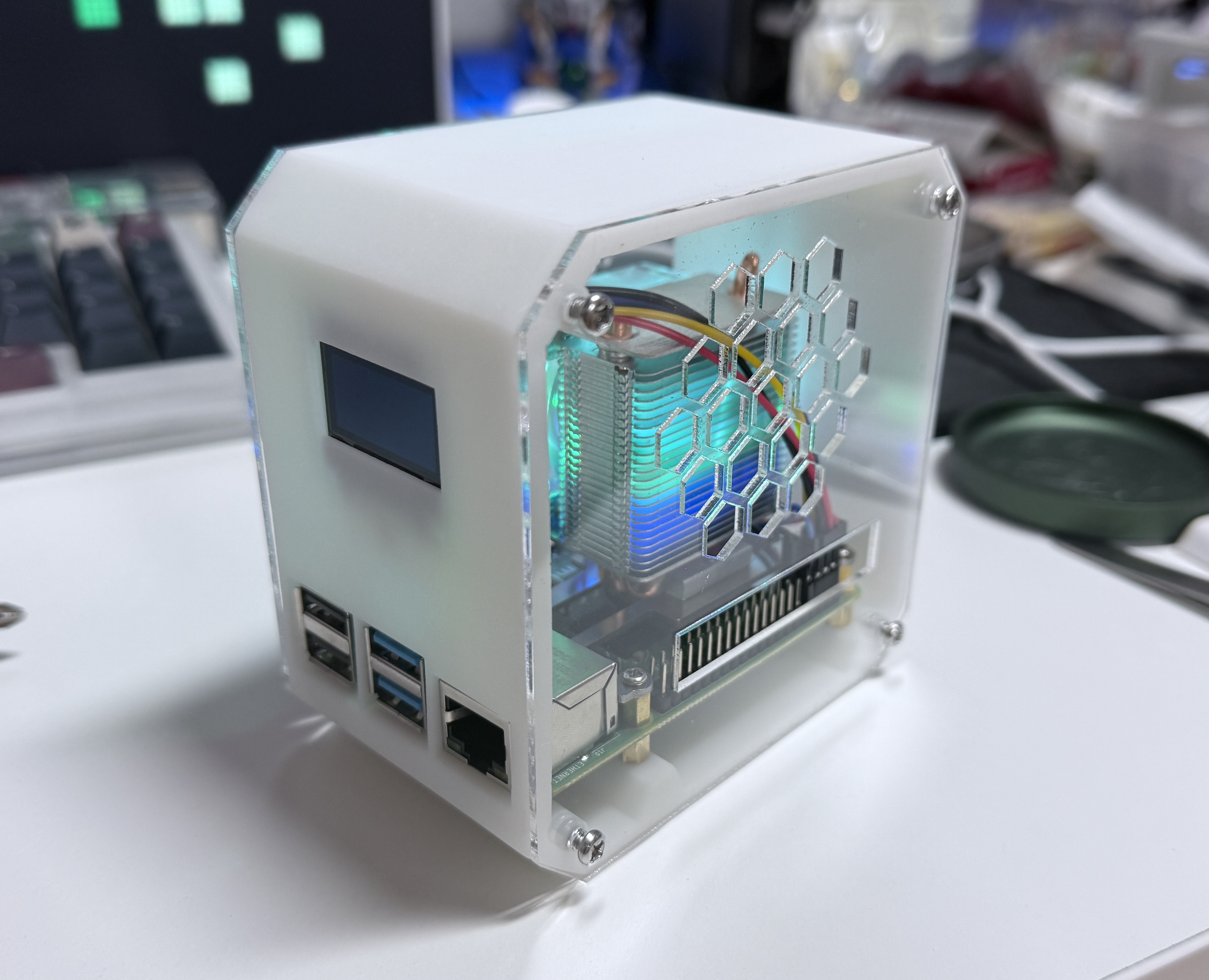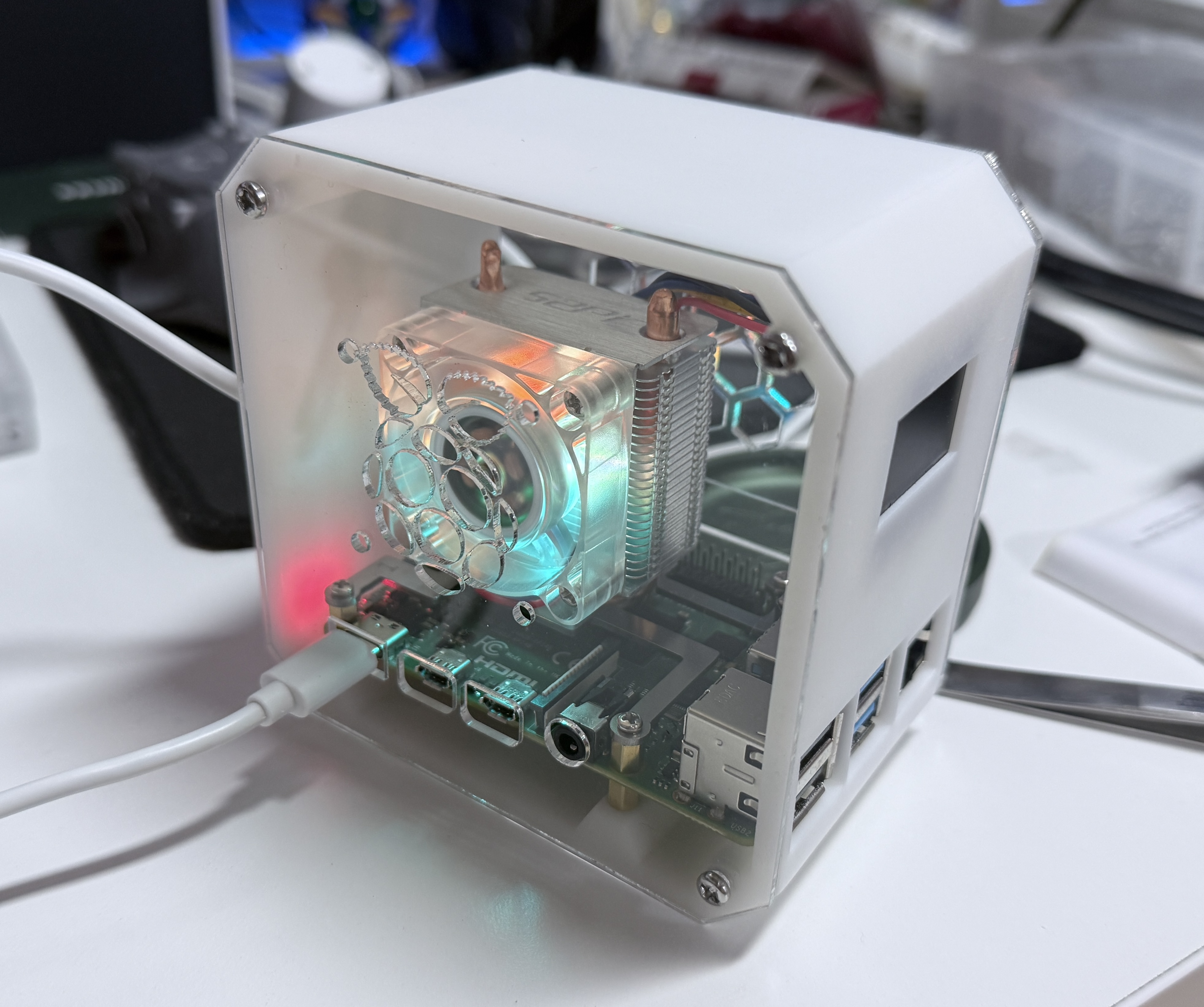 안에는 led 달린 쿨링 타워 팬(?) 이 있고 전면부 디스플레이에는 라즈베리파이에 관련된 각종 정보를 표시해주는듯 보였다.